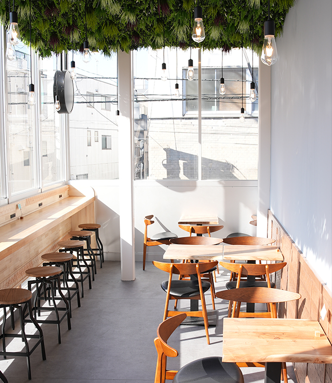 2Fカフェスペースは、暖かな日差しと緑豊かな空間で、居心地良く過ごすことができます。